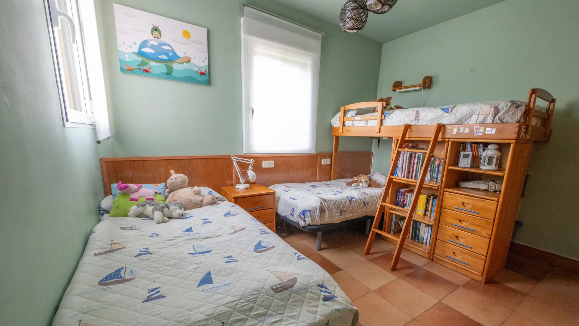 Godello es una habitación acogedora en la planta superior con vistas al jardín. Ideal para niños o grupos pequeños que buscan habitaciones rurales cómodas dentro de un alojamiento tranquilo y familiar.